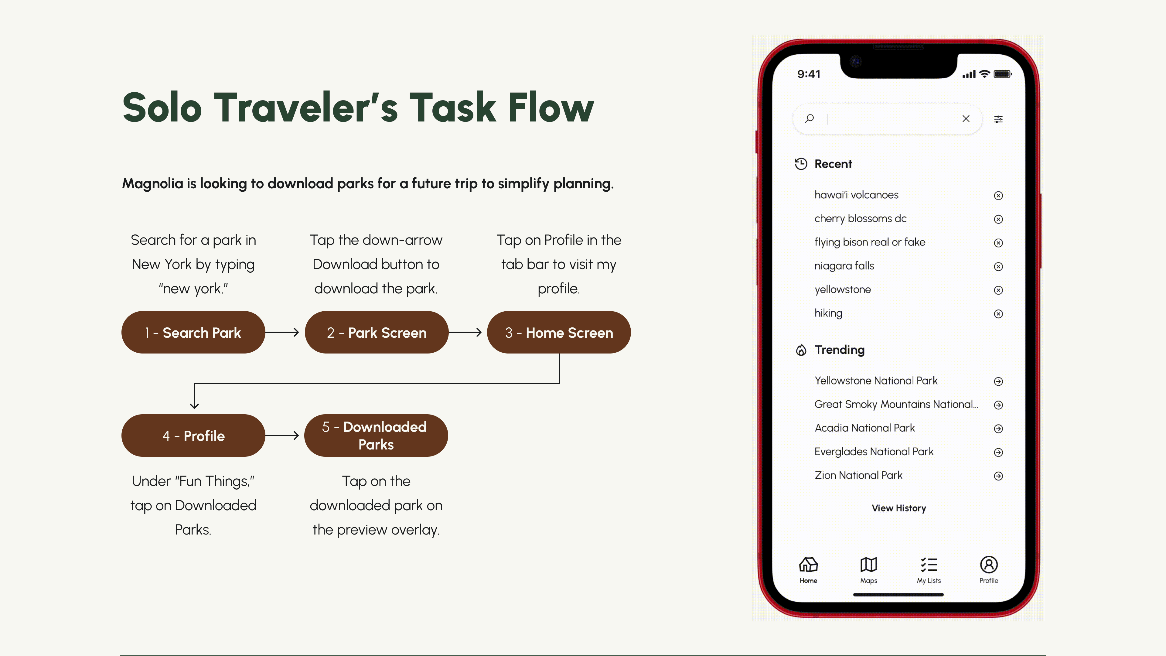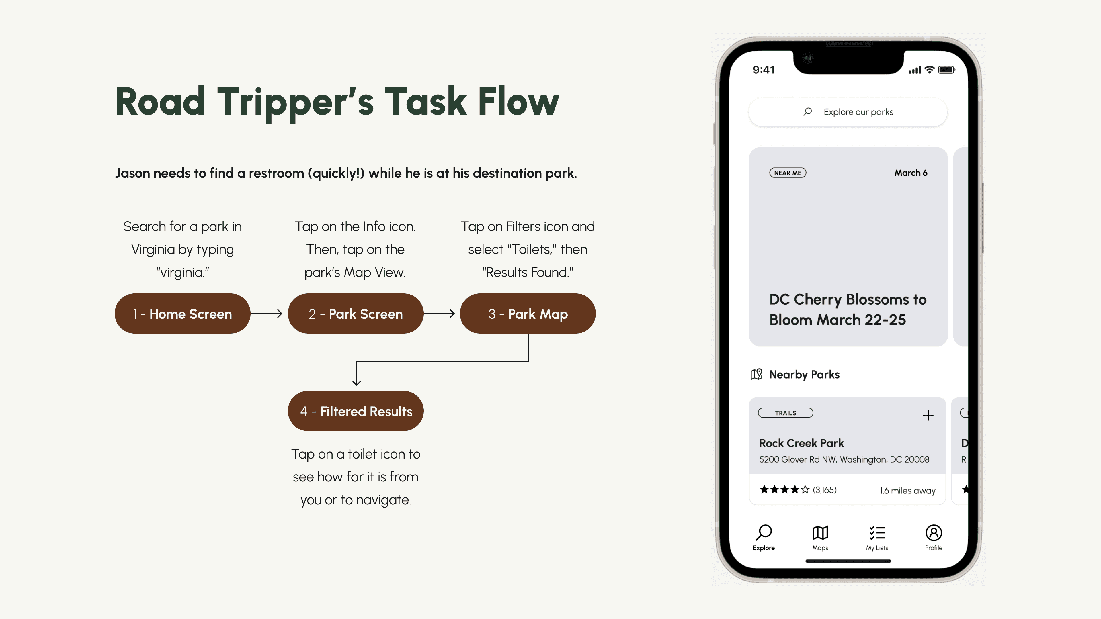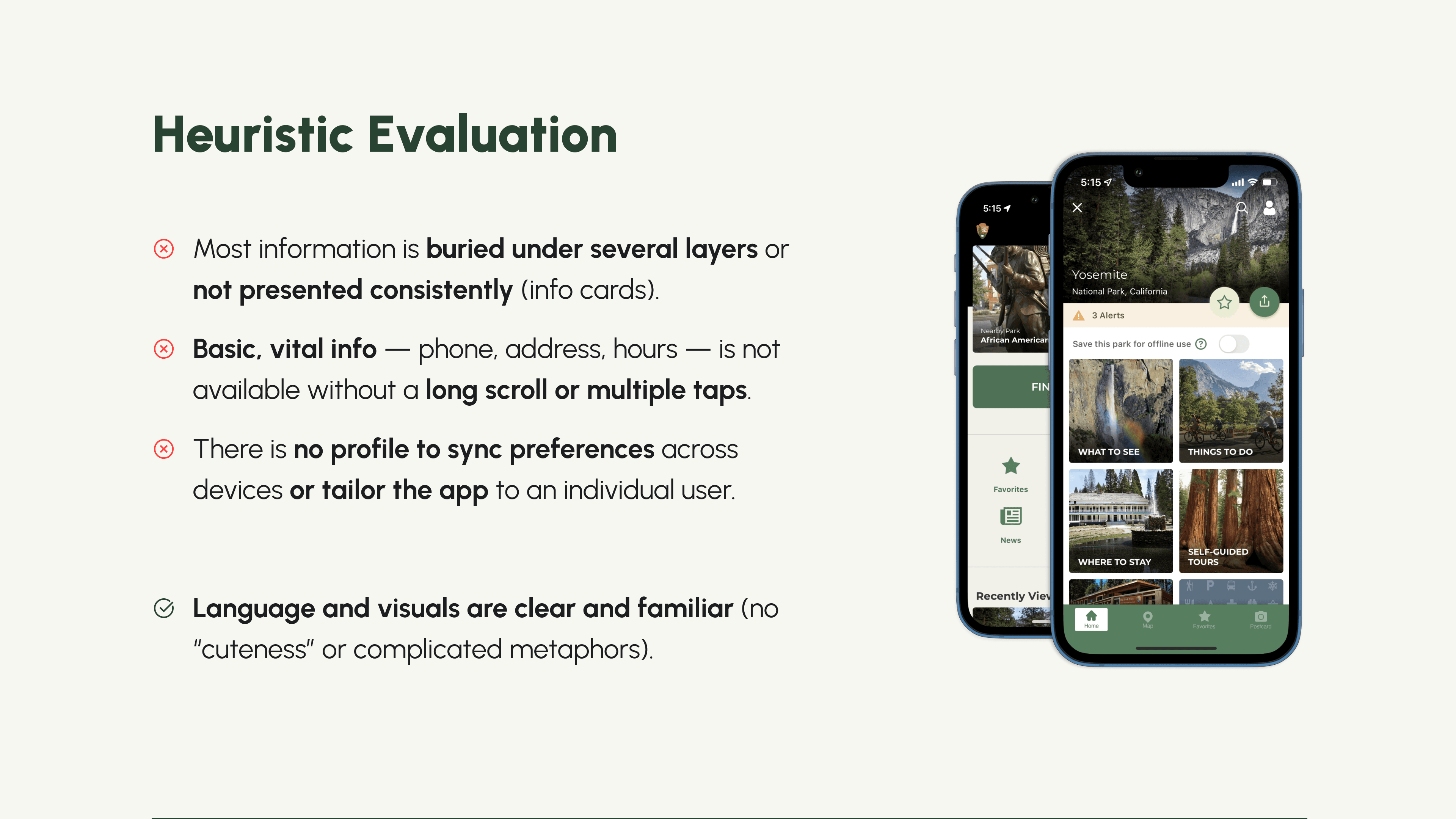 The goal in this multi-week team project was to conduct a heuristic evaluation of the existing NPS app user experience, assess the information architecture for a frictionless search experience, and unify disconnected sections of the app to better inform prospective visitors.