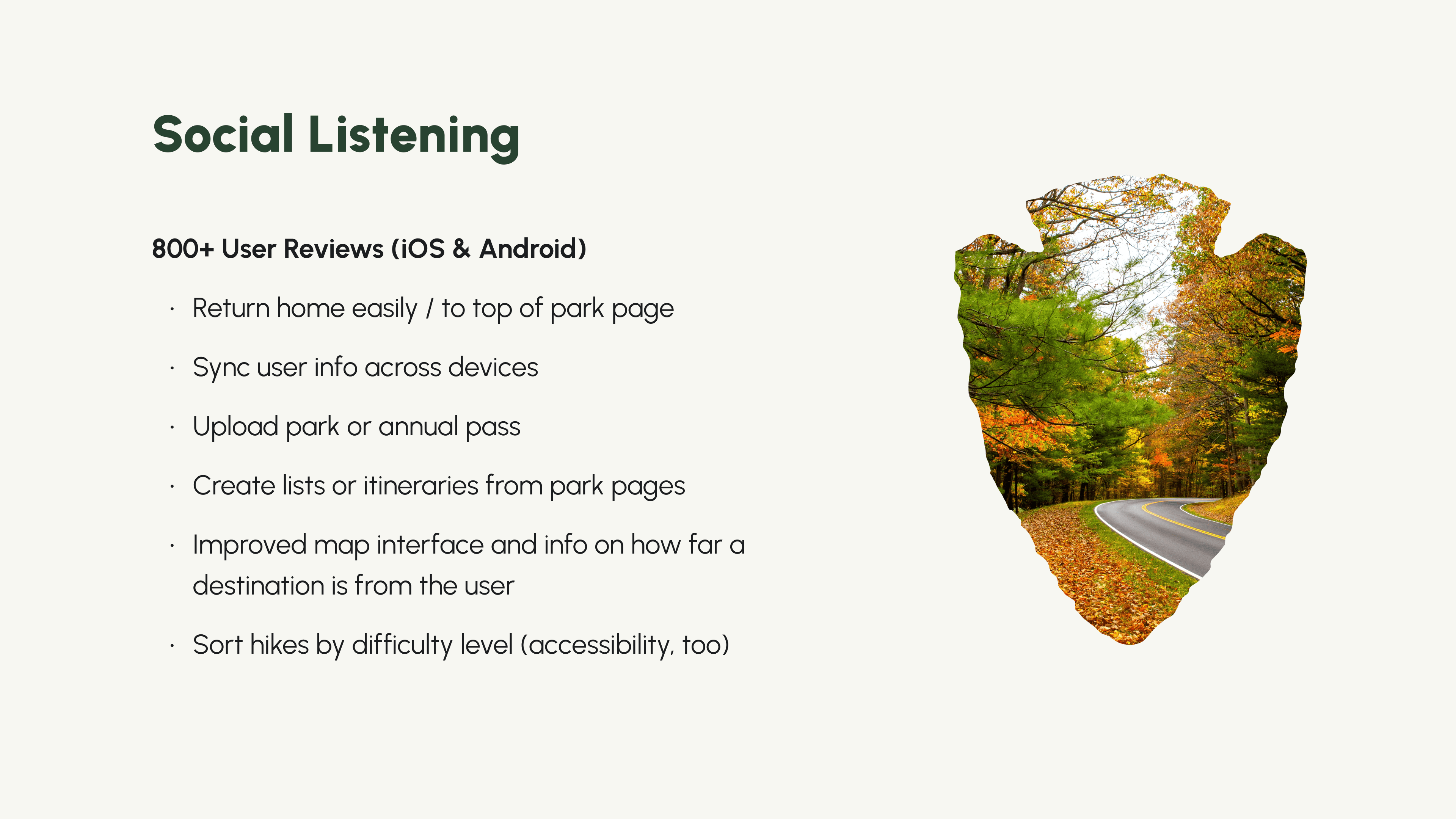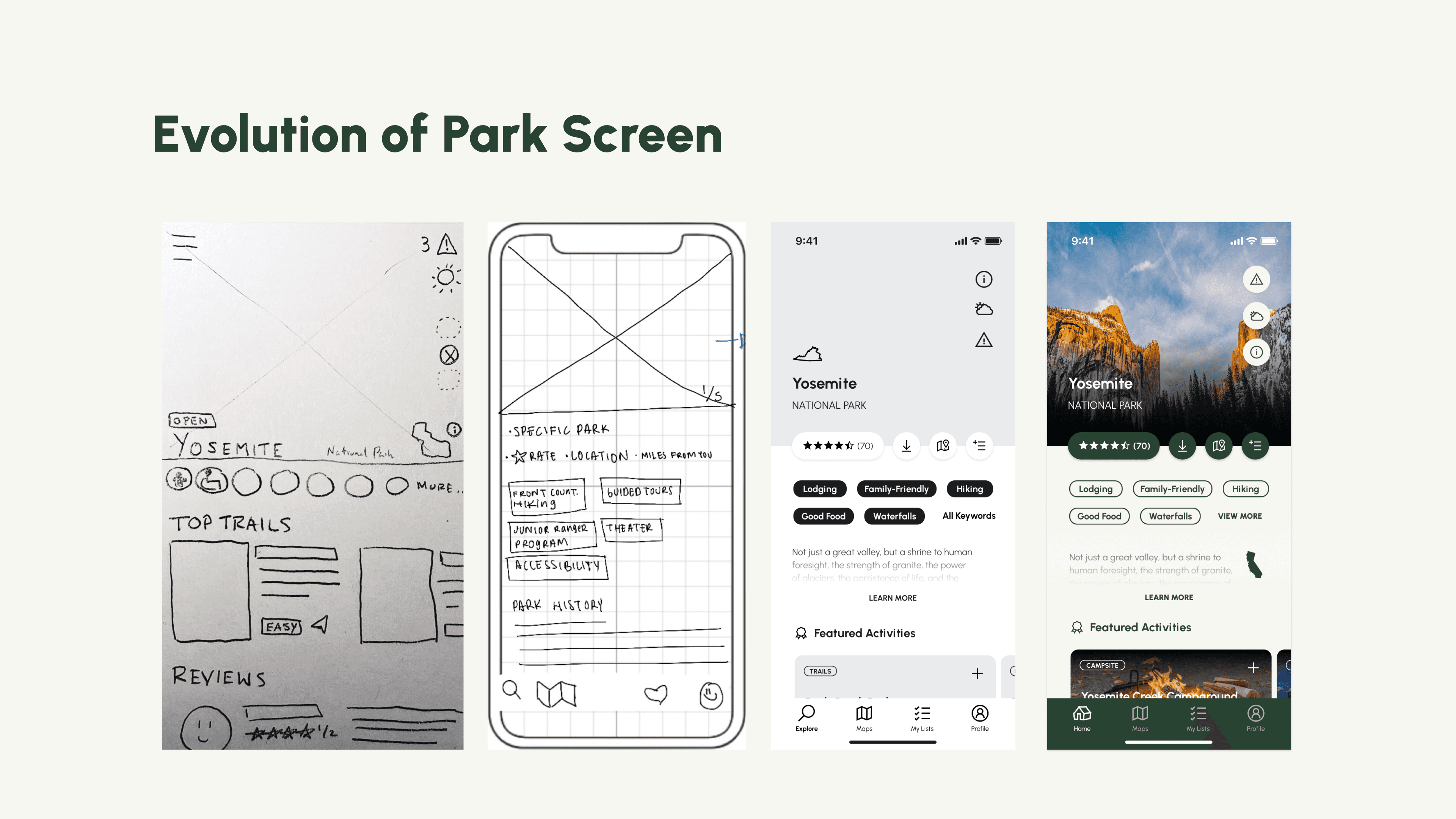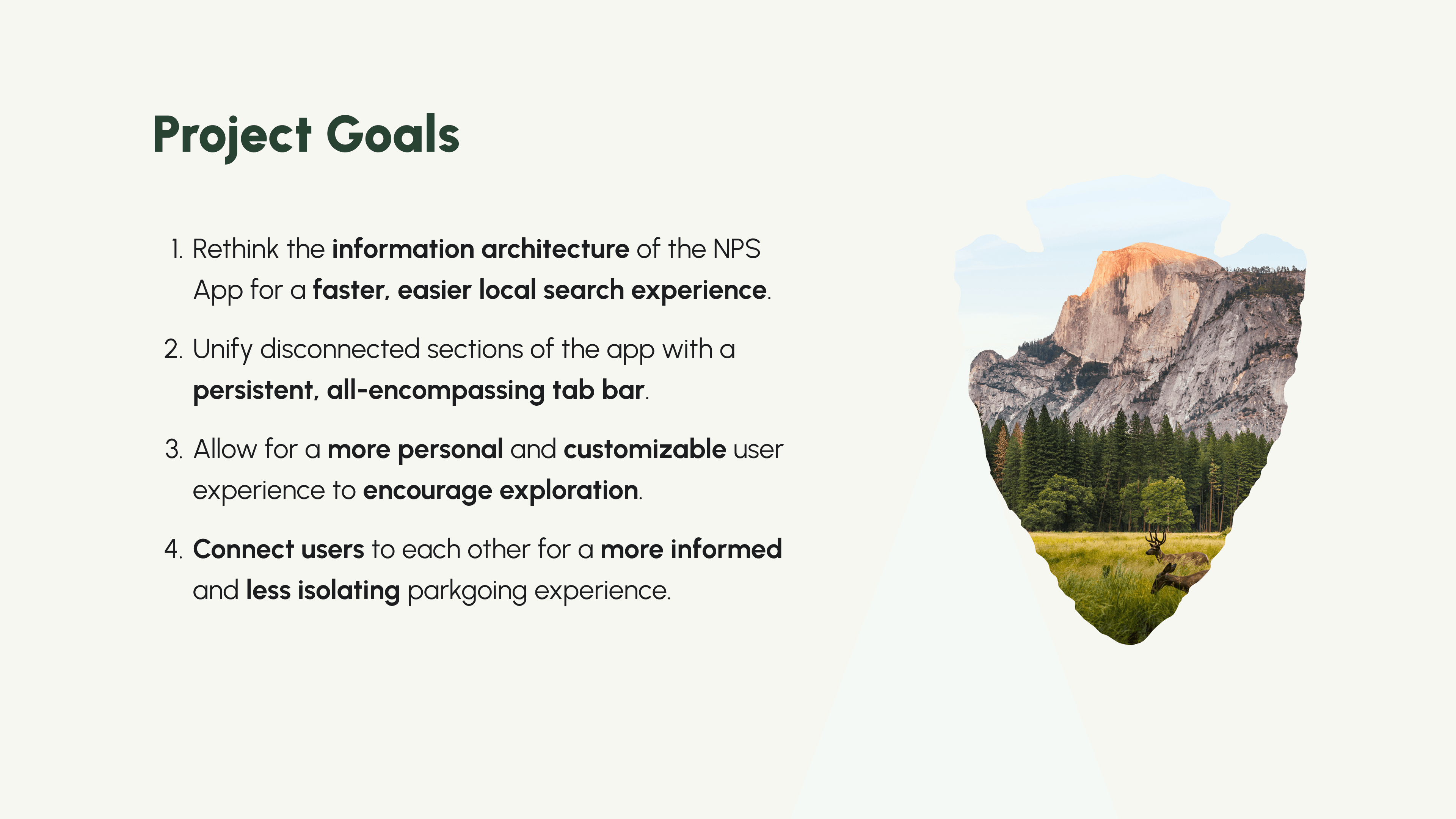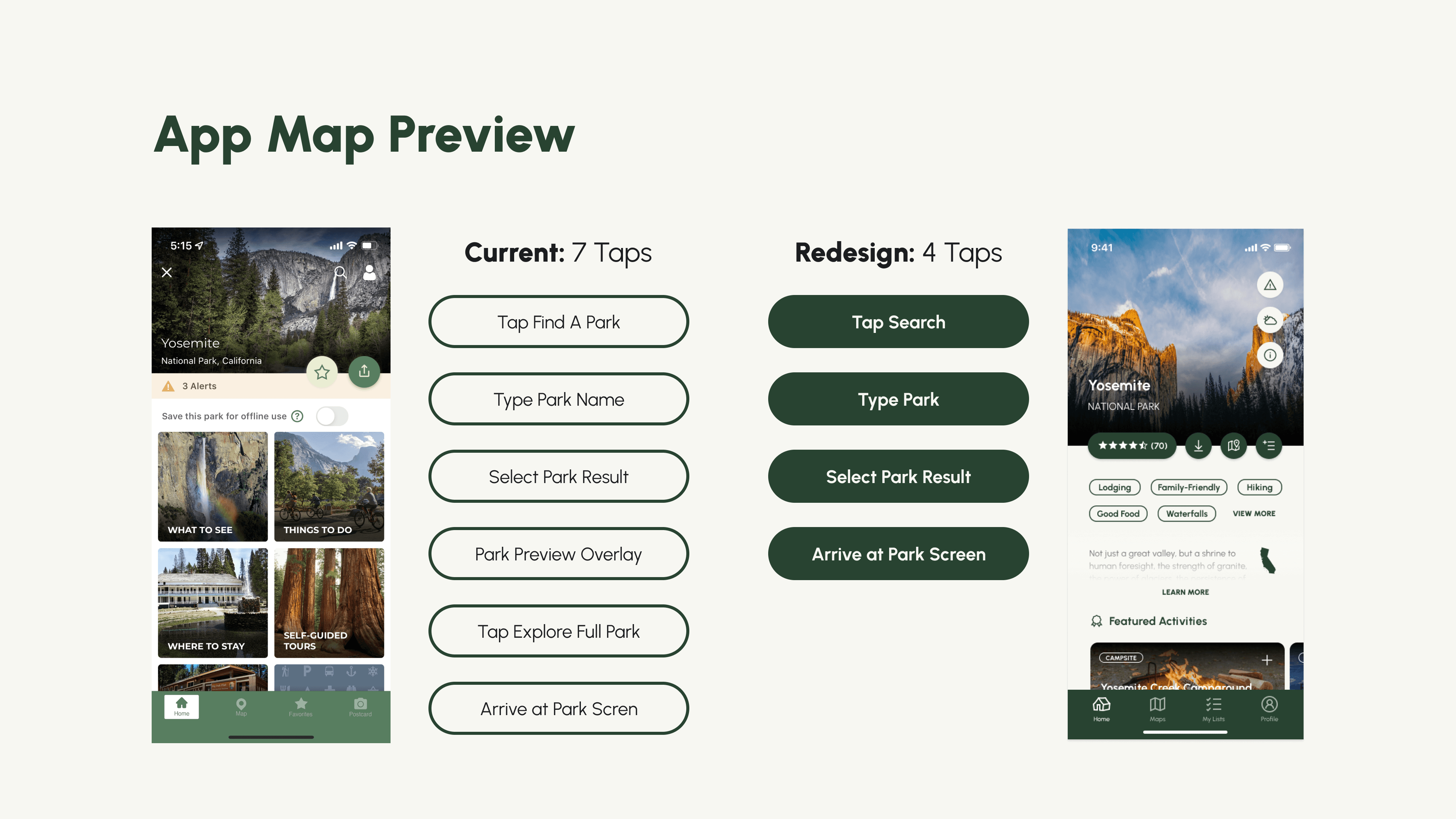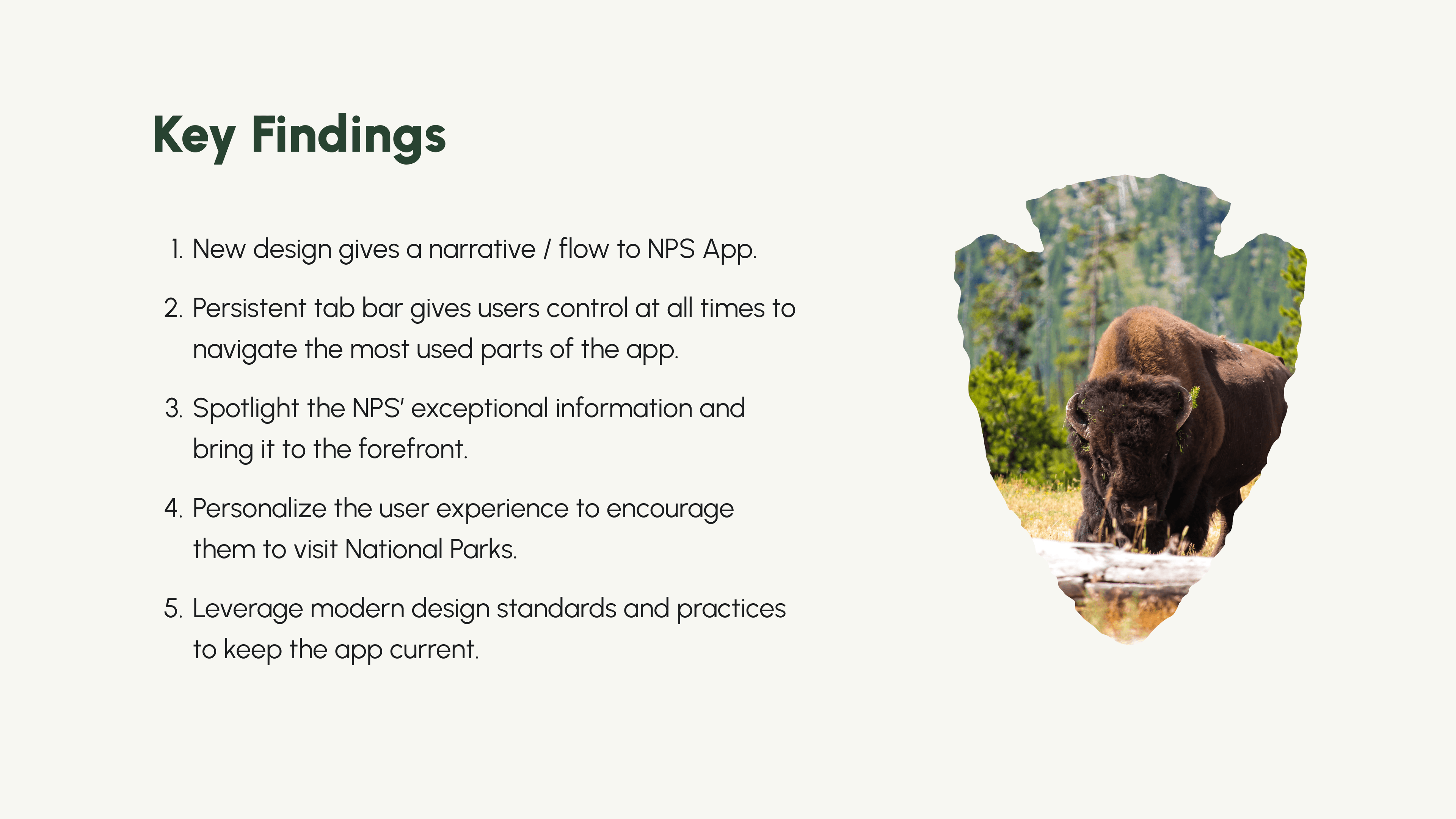The solution included the development of a “narrative flow” to the NPS app anchored by a persistent tab bar — giving users control at all times as they explore the national parks. Enhancing elements of the design through customization creates a more personal user experience, too.