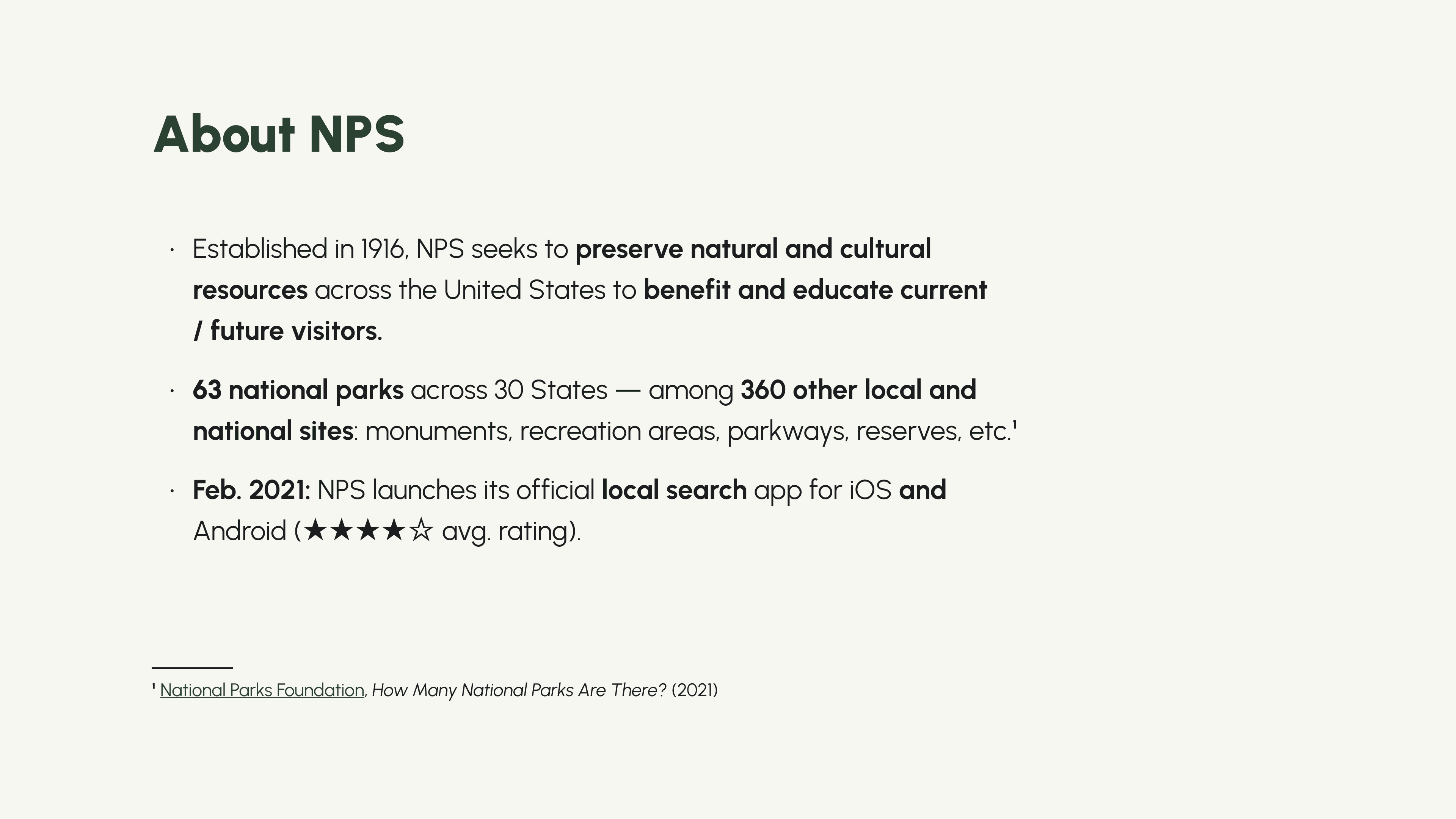 National Park Service (NPS) seeks to preserve natural and culture resources across the United States to educate current and future visitors. Launched in 2021, the NPS app seeks to bring information about all 63 national parks and 360-plus other sites to those interested in visiting or simply learning more about NPS.